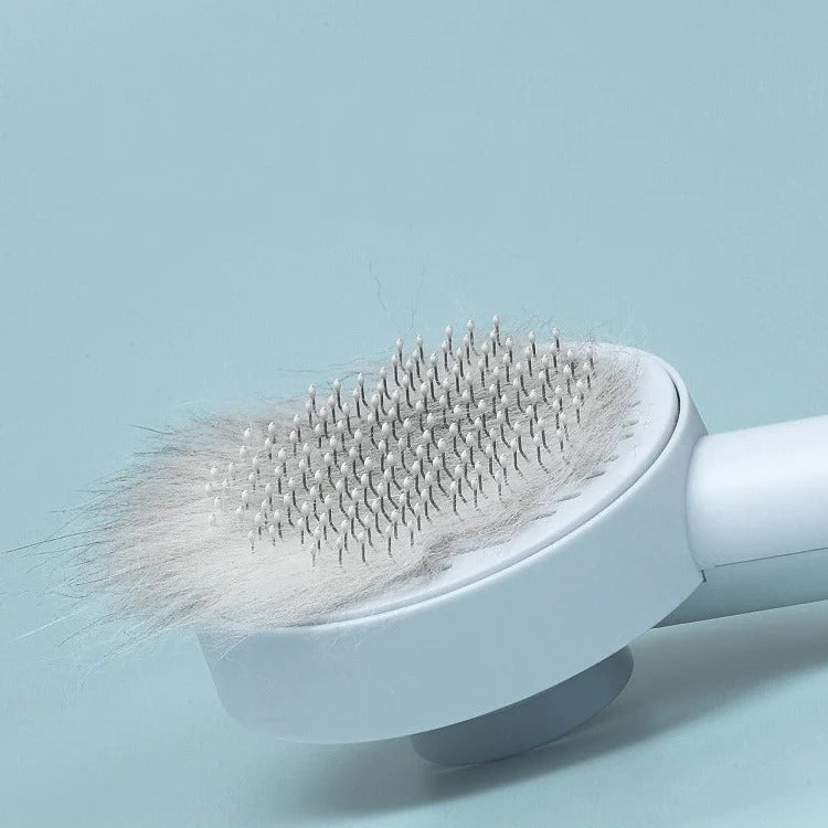 Once you're finished grooming your cat, press the button on the back of the brush to remove any loose fur from the bristles, done!