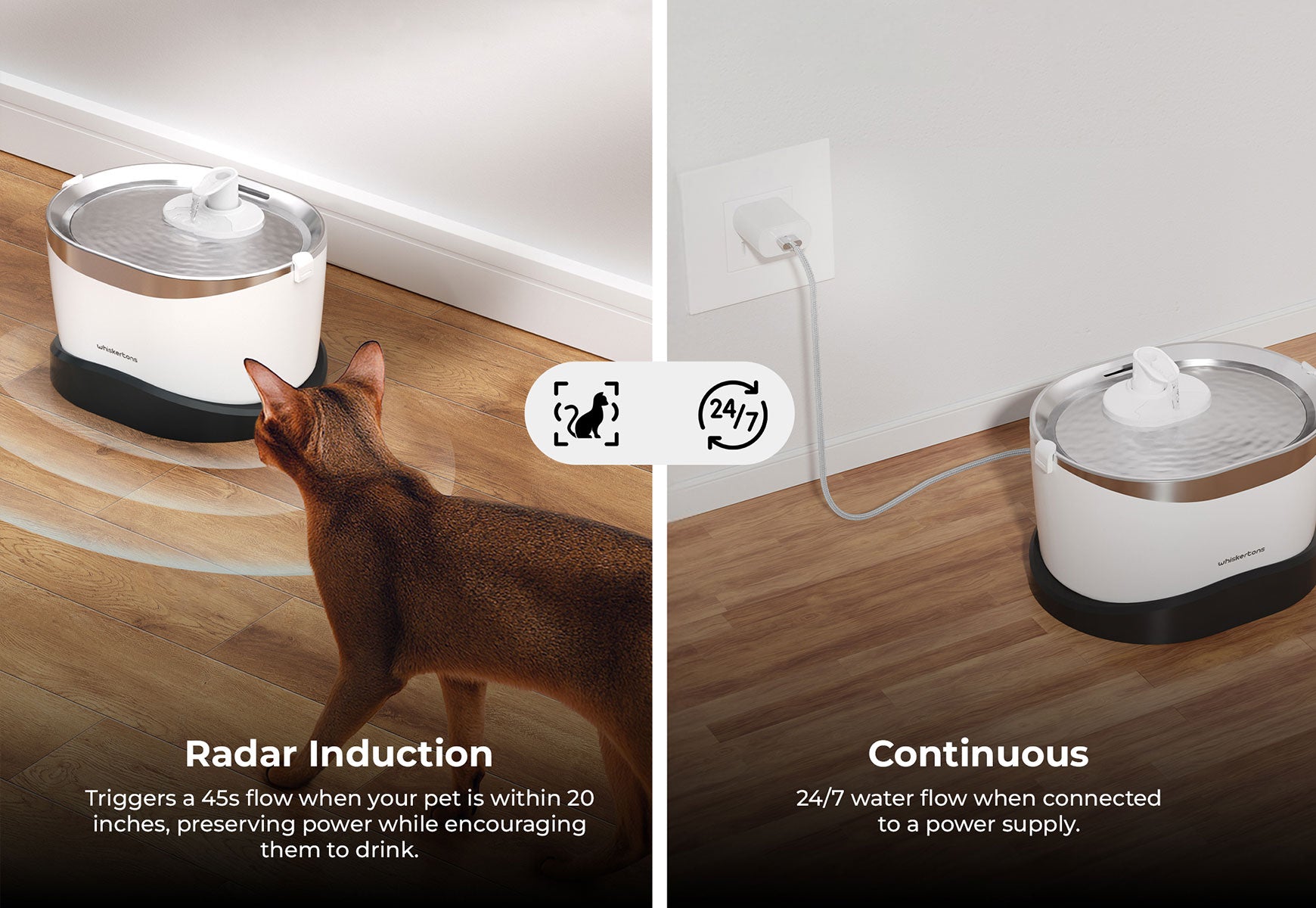 • The fountain is equipped with a radar sensor that encourages your pet to drink while preserving power.